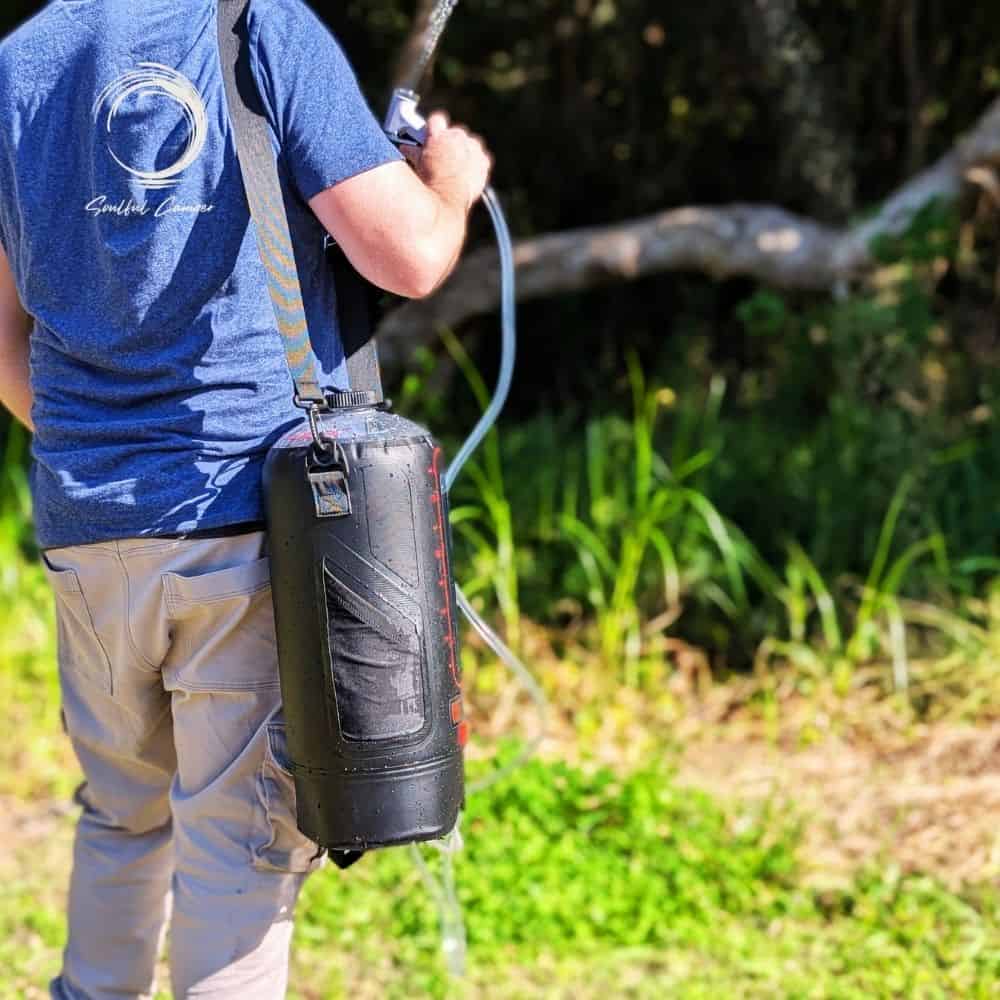 It gives you more than enough for a full body rinse or a two-person quick wash, without being too heavy to carry or slow to heat up under the sun.